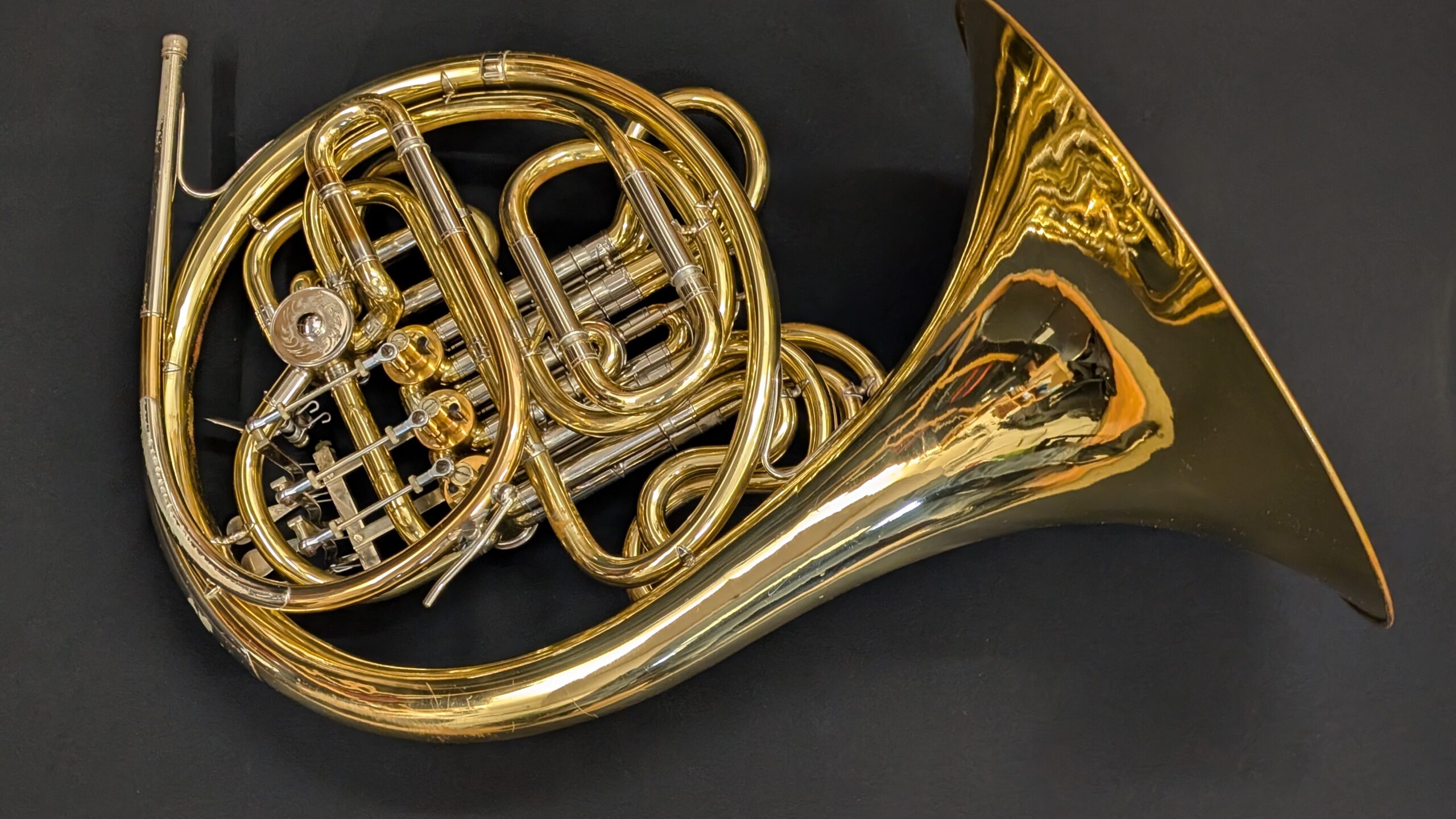 Fixed bell, lacquered, with a nice vibrant sound, this horn has plenty of charm and loads of life left.