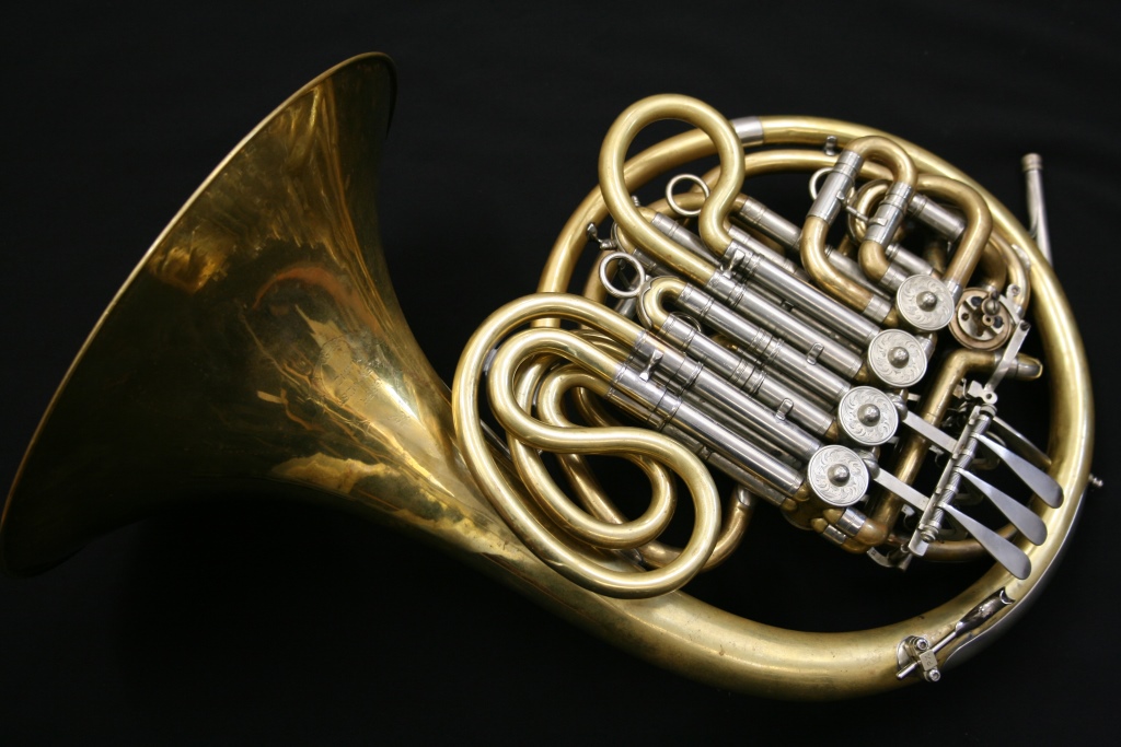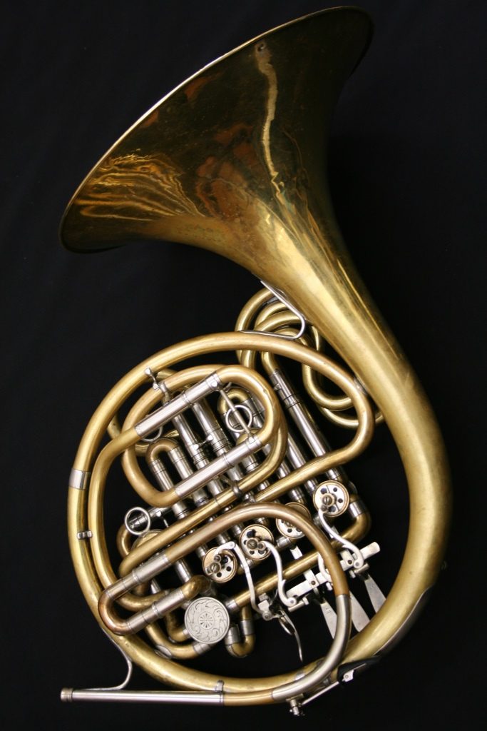 This is a relatively early example of an Alexander 104. Full double Bb/F with a stopping valve. It is unlacquered, yellow brass with a fixed bell and most likely dates from the 1960s or even earlier. With good valve compressions and in very good condition for its age, this horn has the modern additions of duck’s foot/flipper and adjustable finger hook. The horn comes with the original (or at least contemporary) Alexander case. Mostly though, and for purely aesthetic reasons, I am loving the hand engraved valve caps!