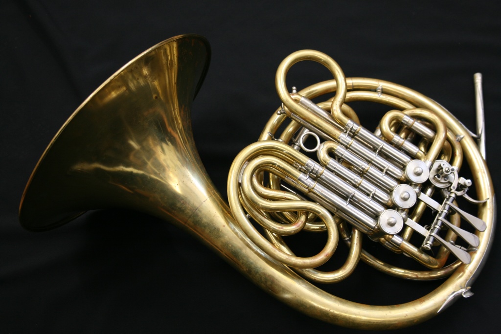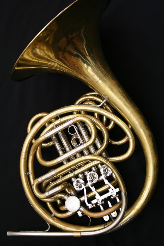 This is an intriguing, un-named/un-branded full double Bb/F horn copy of an Alexander 103 which we’ve been told came from the Moldovan ballet orchestra – most probably made in East Germany in the middle of the 20th century. If you know better please let us know! This horn is unlacquered, yellow brass with a fixed bell and comes in a fixed bell case. If you are interested in different instruments, have always wanted and Alexander but can’t afford the price tag, or even if you want to be the history sleuth then come and try this one out!