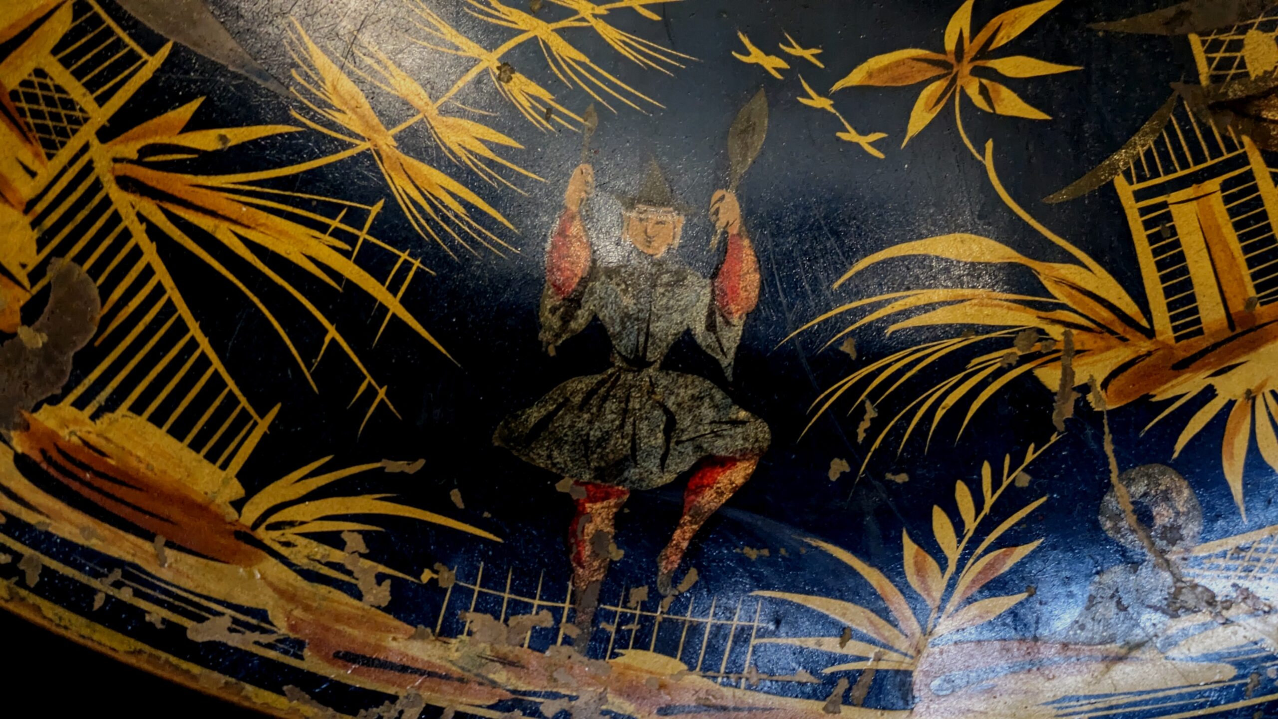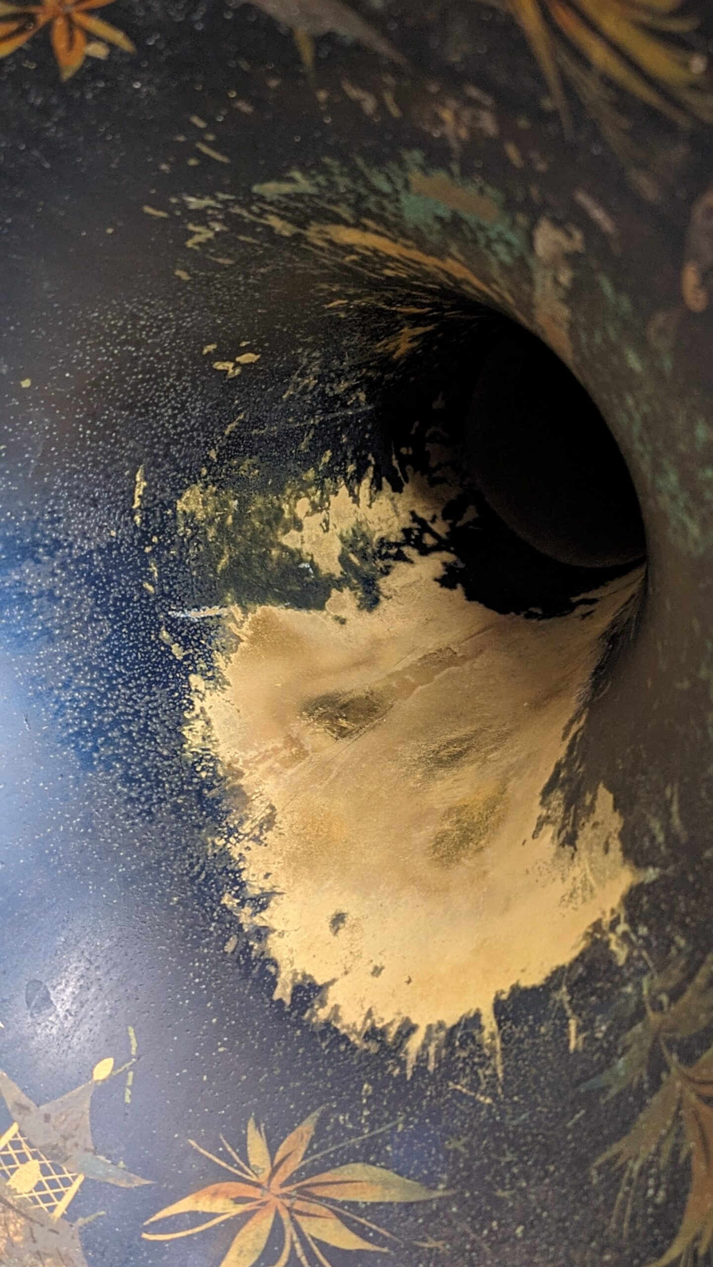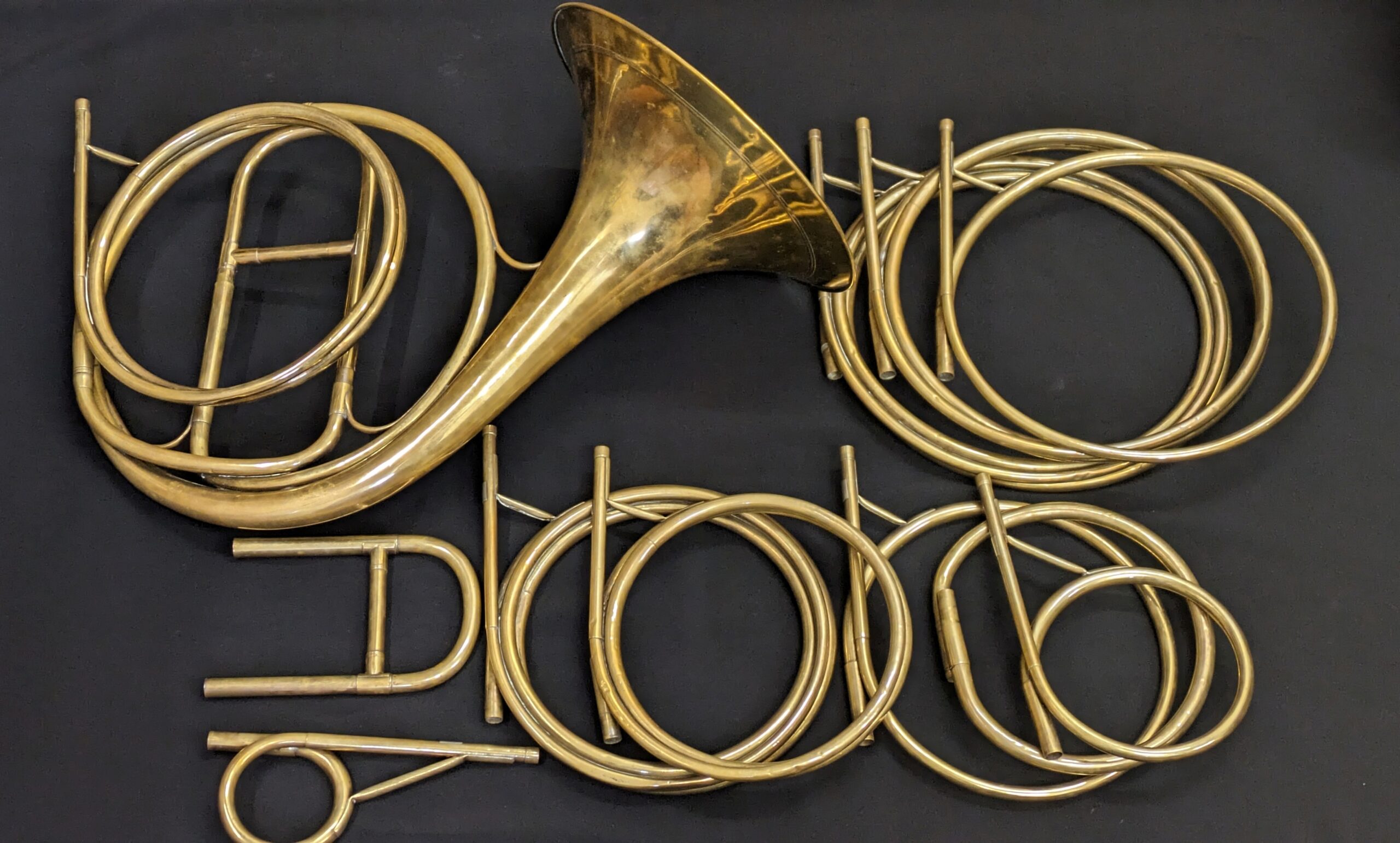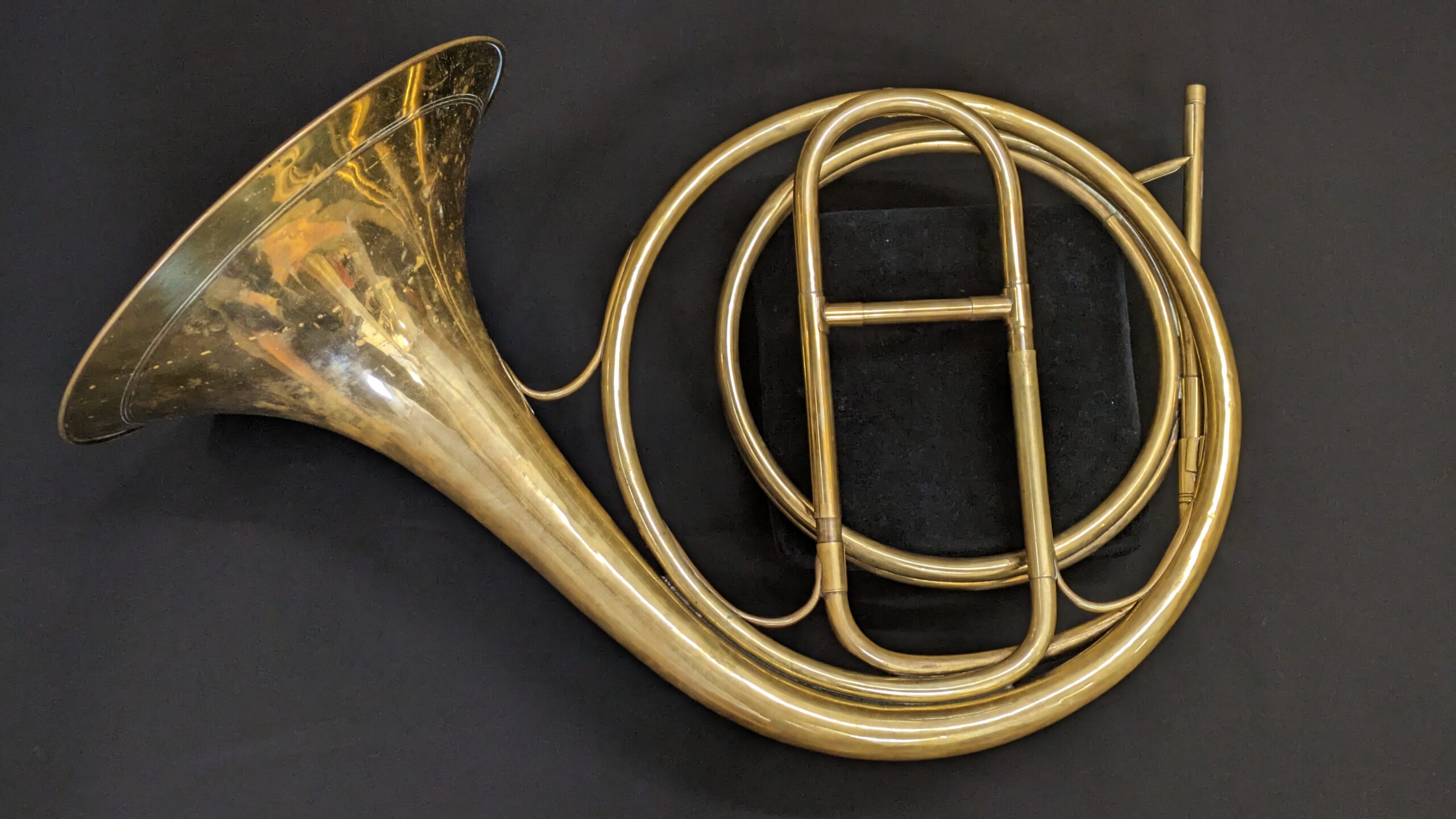 This is a beautiful, historic handhorn dating from approximately 1830 and made by the excellent Parisian horn makers Gautrot. It has a fabulous Chinoiserie-style painted bell. The partial wear on the paintwork gives excellent information about historic left hand positioning and use. Crooks for keys from high Bb to C Basso with a coupler for Bb Basso and slides for A440 and A430.