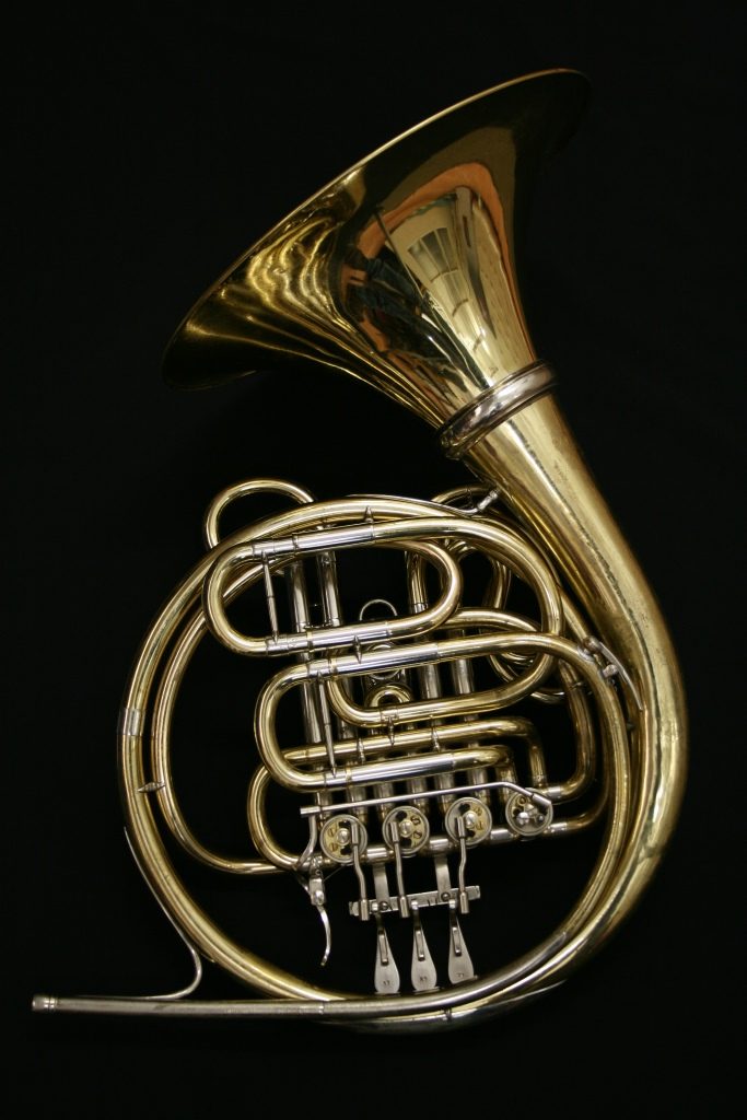 This Hans Hoyer full double horn dates from 1980. It has a medium screw bell and is made from yellow brass. It is lacquered, although this is crazed in some places. Great value European-made full double for grade 4 or 5 and above. It comes with the original screw bell suitcase style case.