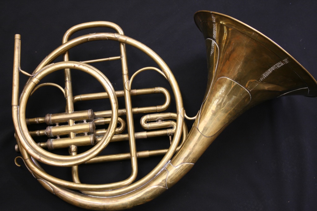 This very patched Hawkes and Son Excelsior Sonorous piston horn would make the perfect (once converted) starter hand horn. It has an F crook and is pitched at A=440. It comes without a case and as usual with a historic instrument is unlacquered with a fixed bell.
