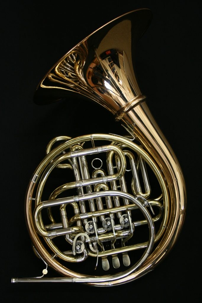 The Holton 281 full double horn utilises the same Kruspe wrap as other popular models such as the 178, 180 and 179, however this horn differs with its mix of different brasses. The main bell section of the instrument is made from a gold brass, or rose brass as it is referred to by Holton, which helps create a darker tone in the quiet passages and brassy when loud. The main bows and tuning slides are yellow brass with the outer slide legs and leadpipe being nickel. This model has a large bell taper and a detachable bell. It is in very good condition, with little lacquer wear. This is a professional level instrument which would suit advanced students (on teacher’s advice), amateurs and professionals alike. It comes with the original screw bell case.