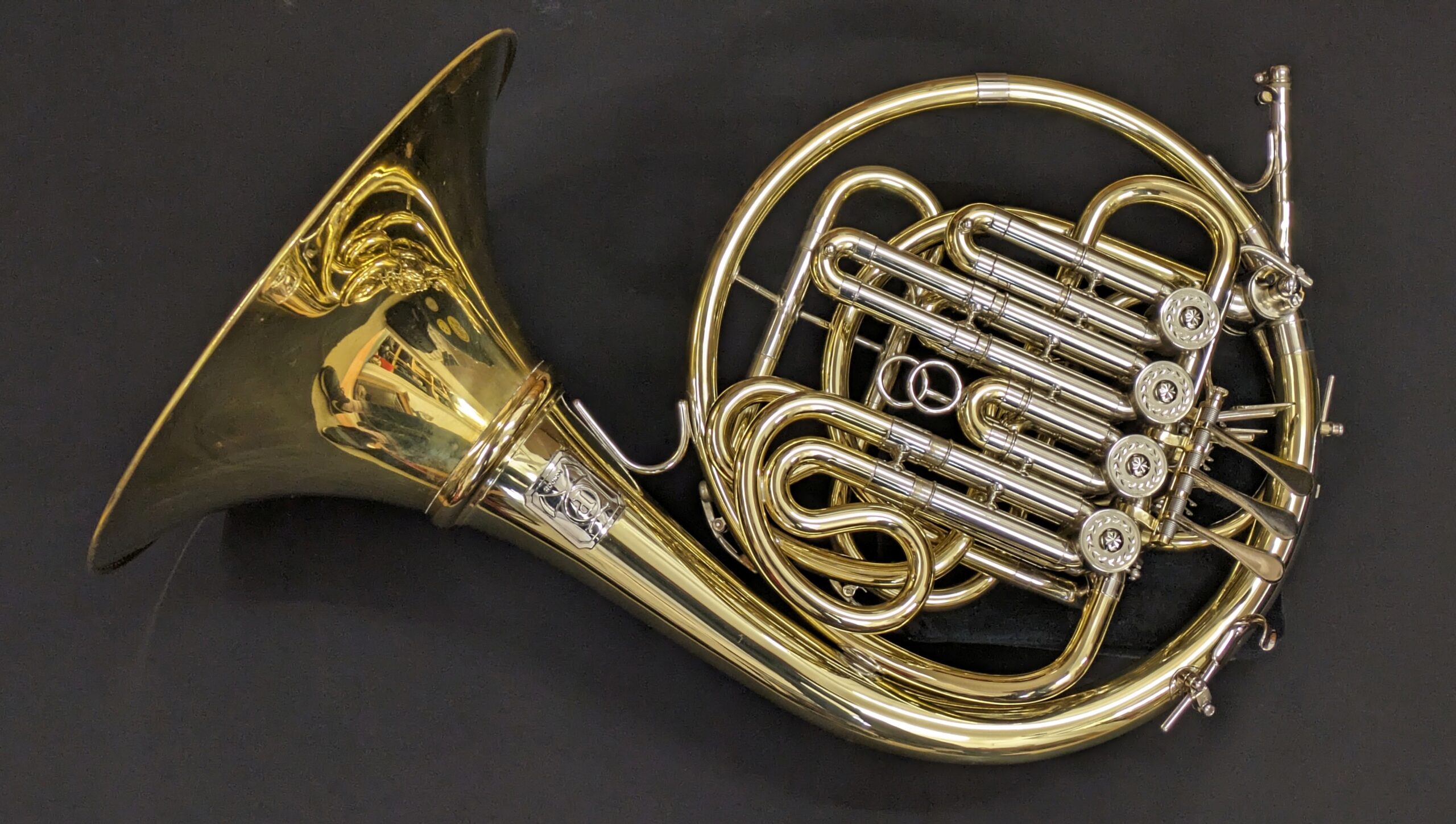 Lovely condition model 45M in yellow brass. This is under 10 years old – it is lacquered, screw bell, with ducks foot and adjustable finger hook.