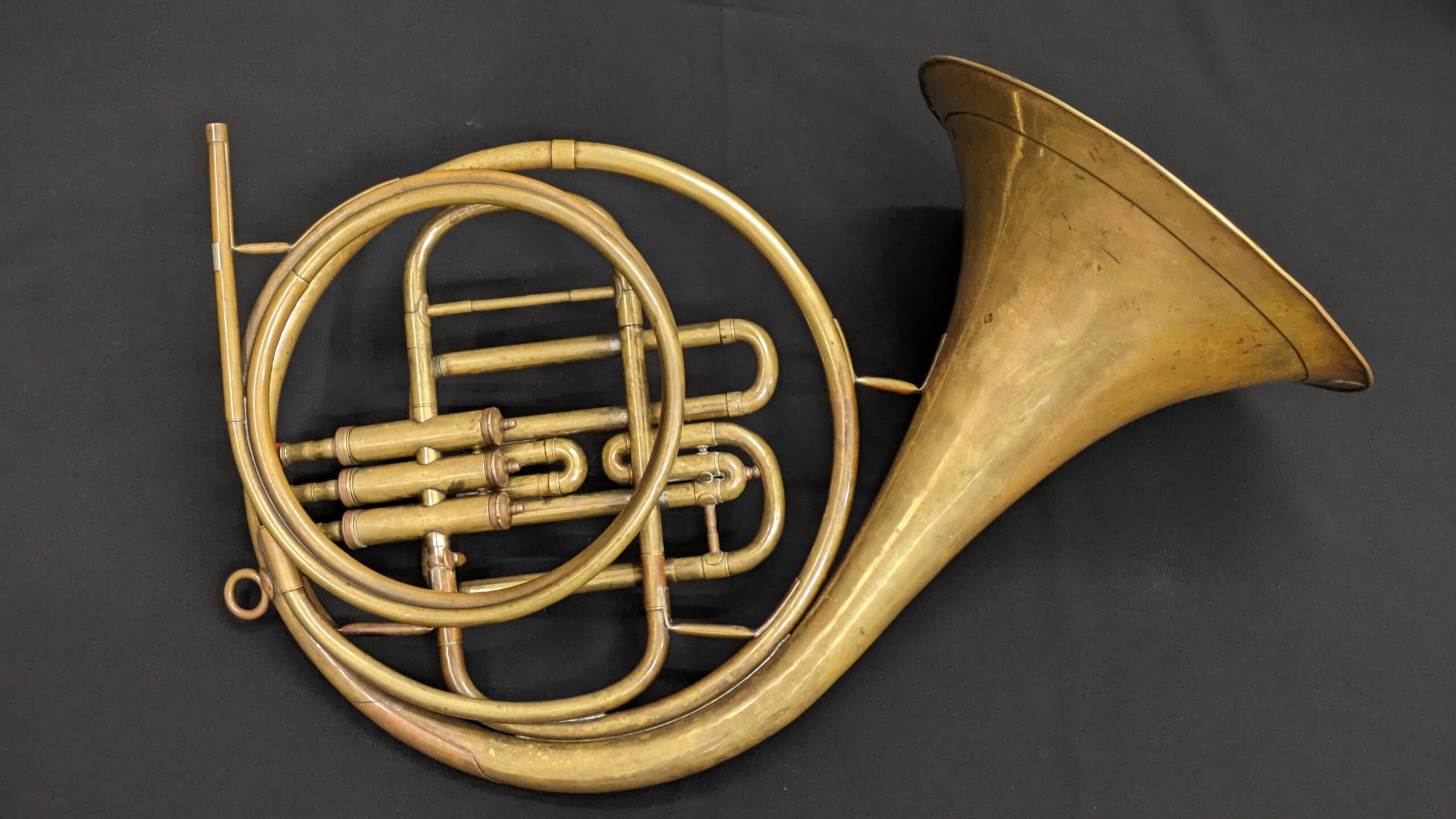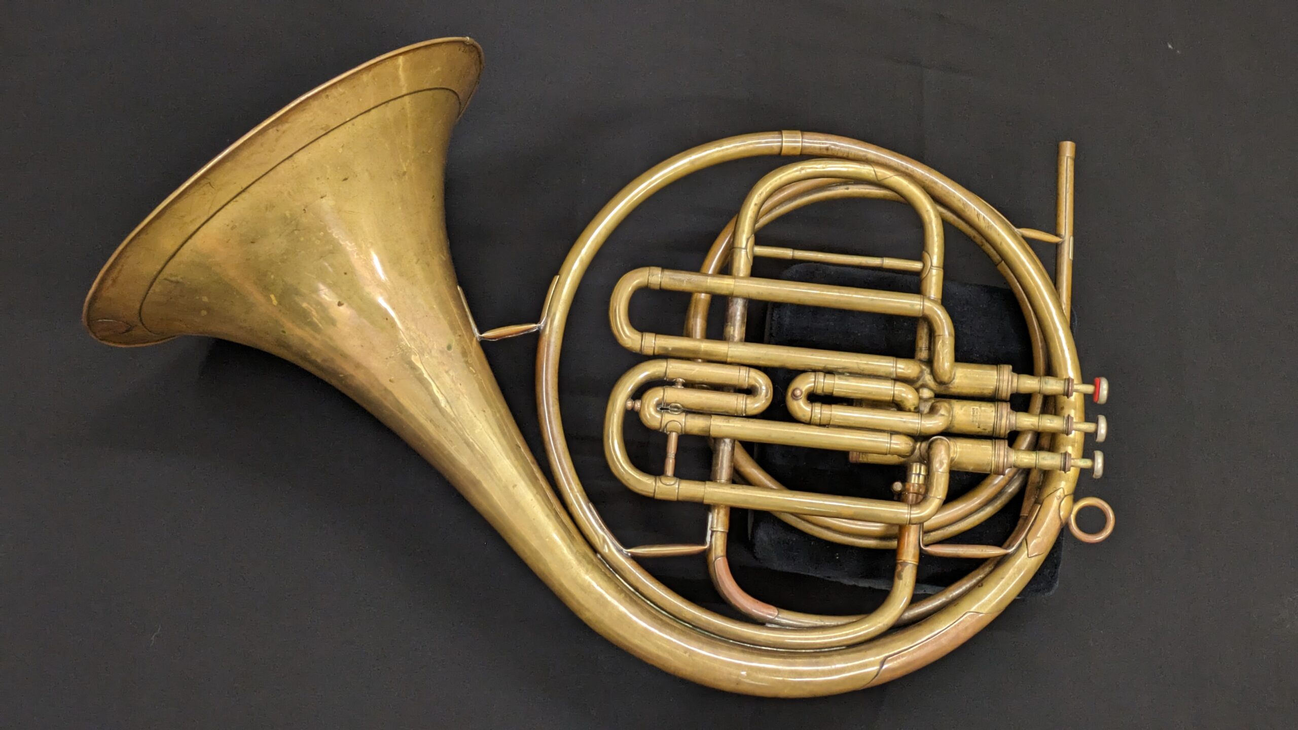 This is a historic Raoux instrument with a removable set of Brown valves. Brown were the most respected of valve makers and were often paired with Raoux horn when possible. There are still signs in the flare of the original and beautiful red and gold paint.