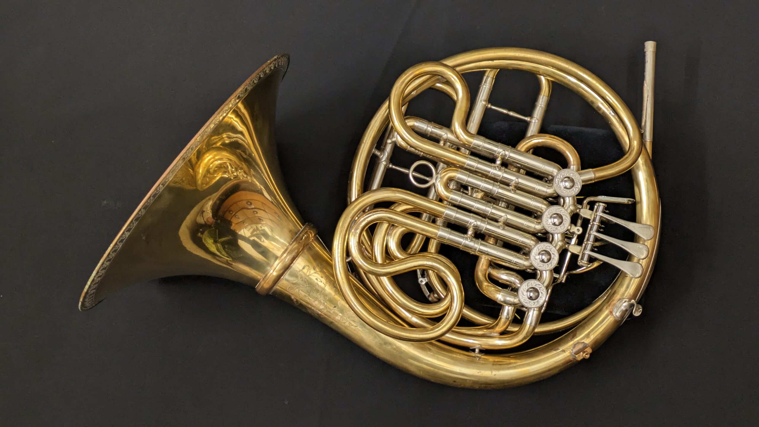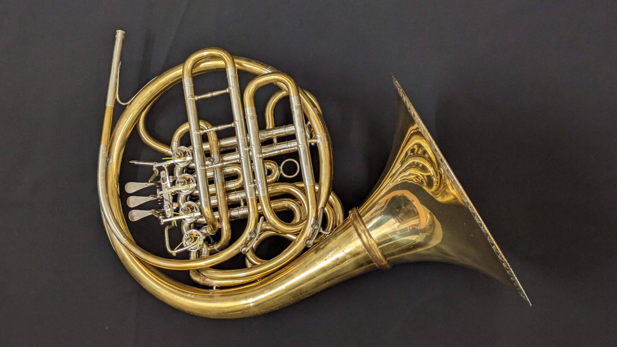 This Schmid full double is being sold at a lower price than we’d usually see for a Schmid horn due to the removal of the lacquer after the horn was damaged by being in an acidic environment. Gold brass for a warmer tone, with a lovely gold brass, hand hammere, medium, garland flare. There are a few places where the lacquer is still visible on the instrument, however this does not effect the way it plays.