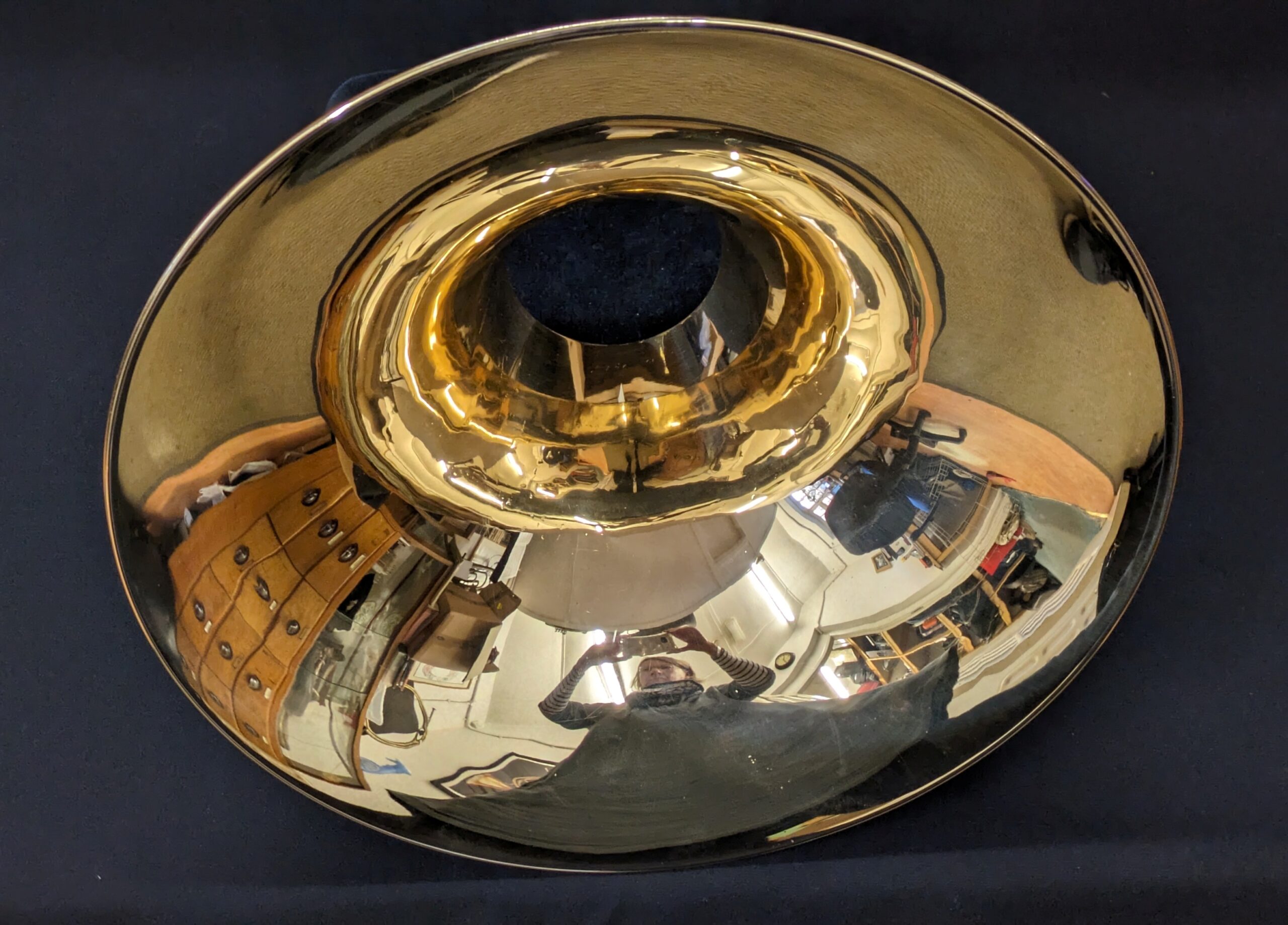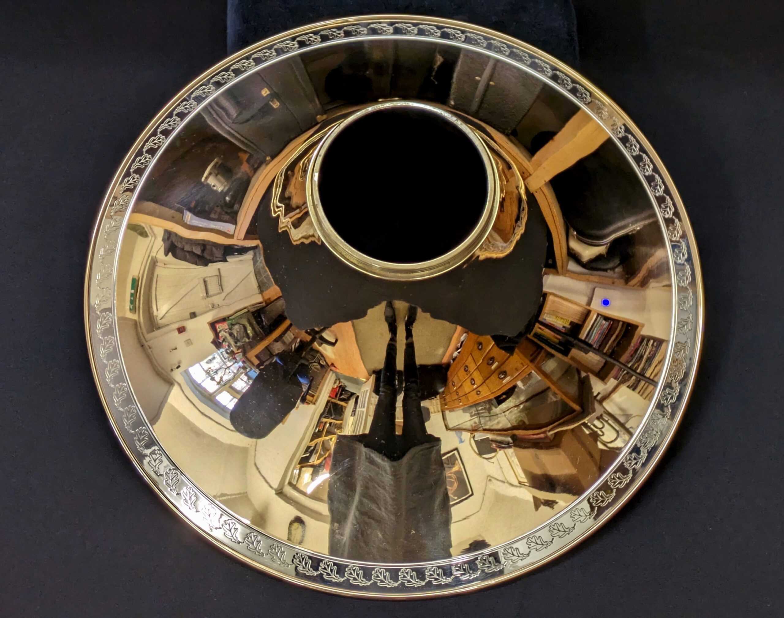 This Schmid flare is in lovely condition. It’s a wide taper flare made in gold brass, spun and with a nickel garland.